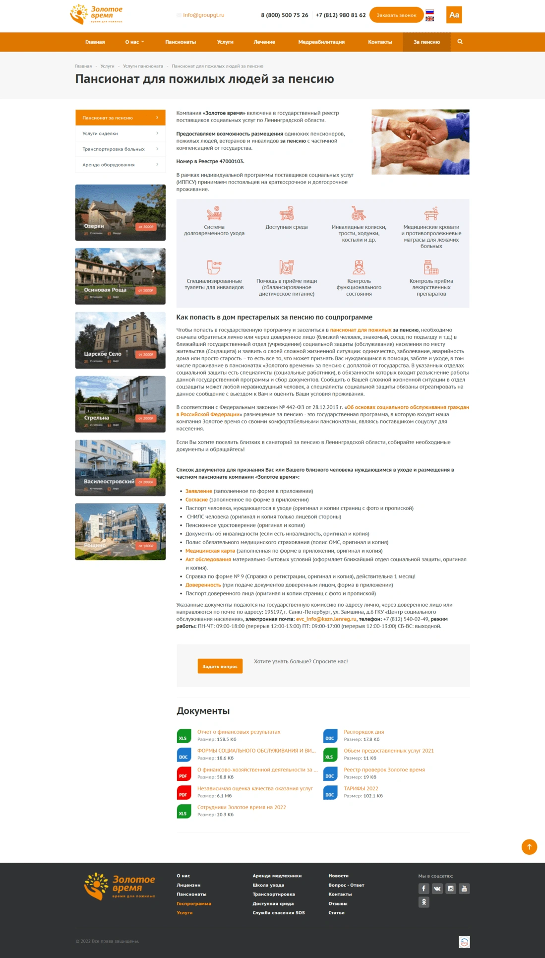 Компания Золотое время - это сеть пансионатов для пожилых людей с комплексным медицинским наблюдением и реабилитацией после травм. В сеть входит 6 пансионатов, расположенных в экологически чистых районах Ленинградской области. Каждый из них предлагает своим постояльцам круглосуточный уход, полноценное питание и комфортные условия проживания.